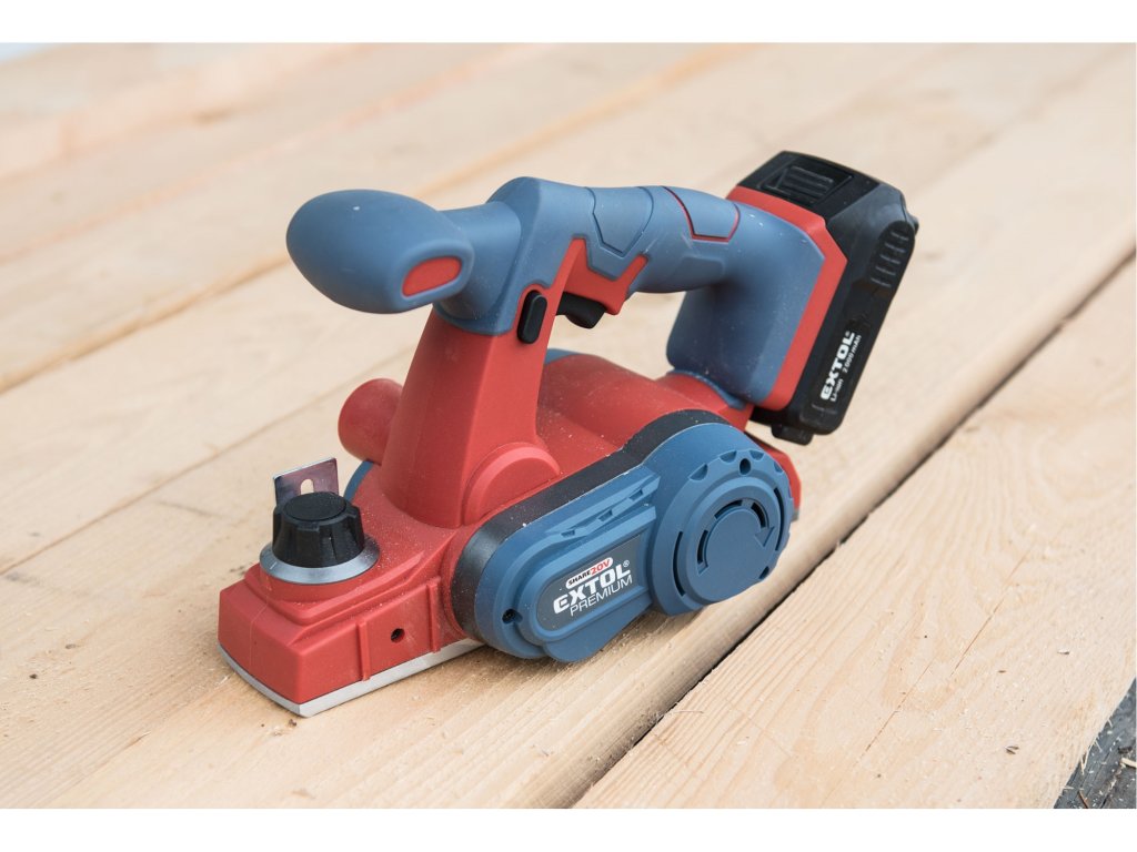 Aku hoblík Extol Premium kombinuje rychlost a výkonnost elektrického hoblíku s pohodlím akumulátorového nářadí. Výsledkem je rychlé a přesné odebrání materiálu bez překážejícího kabelu. Řezná hlava hoblíku má dva kvalitní břity. Ochranný trn v pracovní desce hoblíku chrání čepel i obráběný materiál tím, že udržuje čepel zvednutou a mimo kontakt s povrchem vašeho materiálu mezi řezy. Sběrný vak připojený na prachový výstup pomáhá udržovat pracovní prostor čistý a bez pilin. Přiložený adaptér pro falcování pomáhá vytvářet polodrážky ve vašich deskách a paralelní adaptér udržuje hoblík v nastavené vzdálenosti. Pro běžnou práci dostačují jeden nebo dva 2000mAh akumulátory, které můžete rychle nabít v rychlonabíječce, pro náročnější nebo delší práci doporučujeme větší akumulátory s kapacitou 4000–8000mAh. Akumulátor lze použít ve všech typech nářadí řady EXTOL SHARE20V. Díky použité Li-ion technologii je ho možné kdykoliv dobíjet, aniž by se tím snižovala jeho kapacita. Li-ion akumulátor ztrácí energii vlivem samovybíjení velmi pomalu a vydrží dlouho nabitý a připravený k použití.Doplňkové parametry