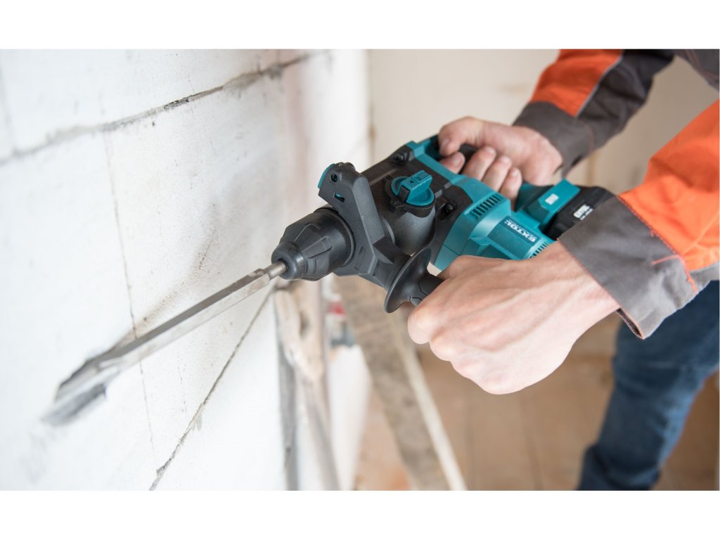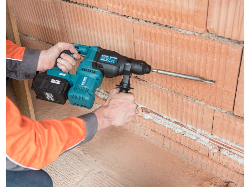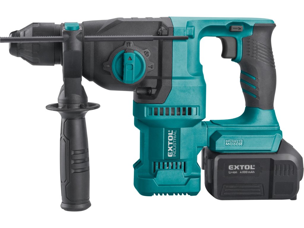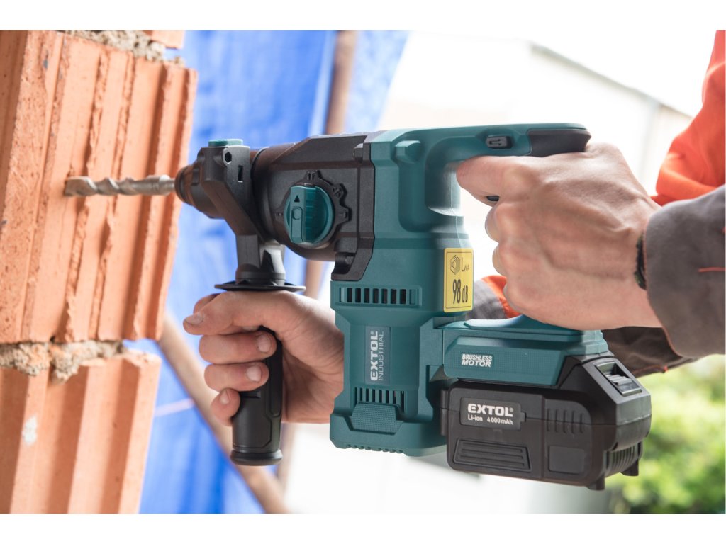Silné aku vrtací kladivo je určeno k rychlému vrtání do cihel a betonu pomocí vrtáků s SDS plus stopkou a menším sekacím pracím. Kladivo má svisle uložený motor, což umožňuje mnohem vyšší výkon než je u kladiv s vodorovně uloženým motorem. Kladivo je poháněno nejmodernějším „brushless" motorem. Tento nový typ motoru má vyšší životnost, je výkonnější a má menší spotřebu el. energie než klasické motory s uhlíkovými kartáči. Díky výkonnému pneumatickému příklepovému systému je schopno vrtat mnohem rychleji a efektivněji než příklepové vrtačky. Veškeré nastavení typů práce jsou integrovány do jednoho přepínače 4v1 na kterém si můžete zvolit jednu s funkcí vrtání, vrtání s příklepem, sekání nebo nastavení polohy sekáče. Kladivo má zámek sekáče, takže si můžete před sekáním sekáč nastavit do patřičné polohy a při sekání bude kladivo udržovat sekáč v této poloze. Jeho hlavní výhodou je akumulátorový pohon, který dovoluje si vzít kladivo s sebou tam kde s ním potřebujete pracovat, bez ohledu na to, jestli tam je rozvod elektrické energie. Kladivo je vybaveno zpětným chodem pro snadné vytažení zaseklého vrtáku a regulací rychlosti, kterou lze využít dle vrtaného materiálu. Integrované LED osvětlení má zpožděné vypnutí a svítí ještě několik vteřin po vypnutí kladiva. Pro běžnou práci dostačují jeden nebo dva 4000mAh akumulátory, které můžete rychle nabít v rychlonabíječce, pro náročnější nebo delší práci doporučujeme větší akumulátory s kapacitou 5000–8000mAh. Akumulátor lze použít ve všech typech nářadí řady EXTOL SHARE20V. Díky použité Li-ion technologii je ho možné kdykoliv dobíjet, aniž by se tím snižovala jeho kapacita. Li-ion akumulátor ztrácí energii vlivem samovybíjení velmi pomalu a vydrží dlouho nabitý a připravený k použití.Doplňkové parametry