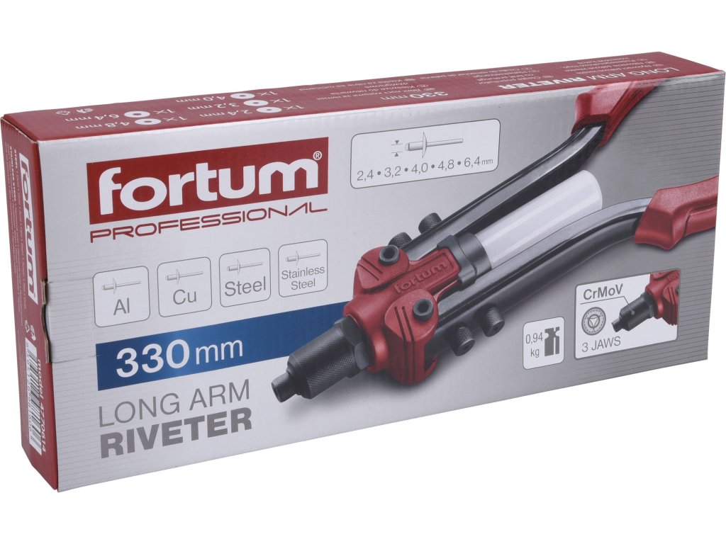 doplňující parametr: | 330mm, pro trhací nýty 2,4-3,2-4,0-4,8-6,4mm z materiálů Al, měď, ocel, nerezová ocel |