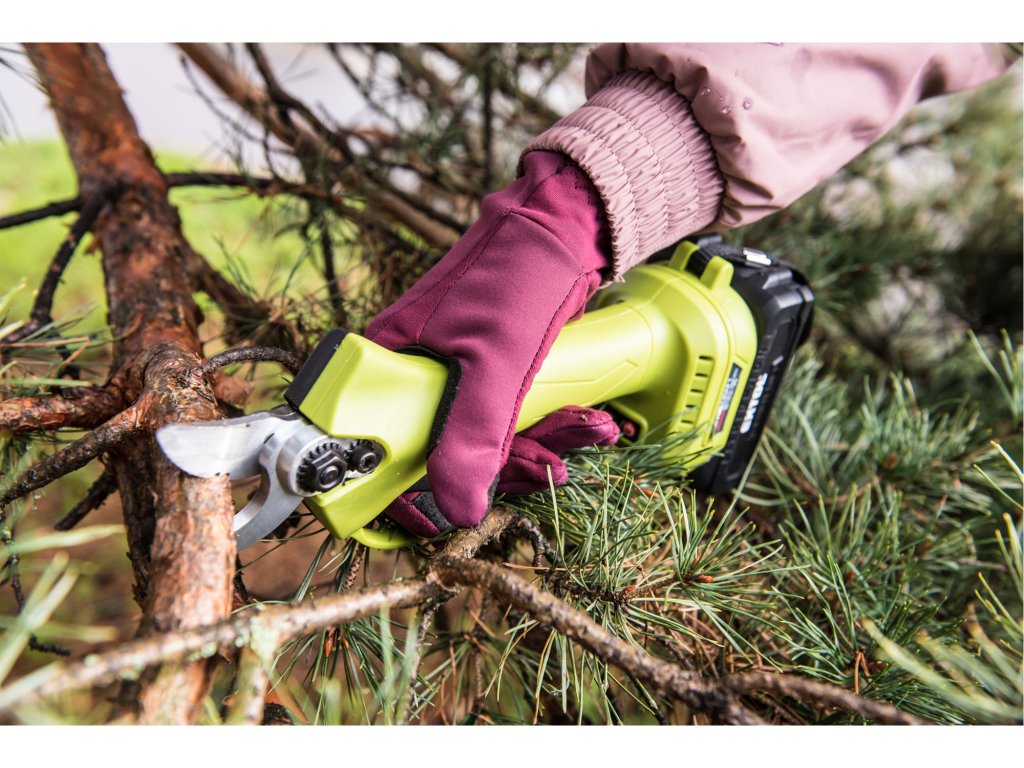 Zahradní aku nůžky umožňují snadné stříhání větví stromů a keřů a stonků rostlin o průměru do 25mm. Nůžky jsou poháněné nejmodernějším „brushless" motorem. Tento nový typ motoru má vyšší životnost, je výkonnější a má menší spotřebu el. energie než klasické motory s uhlíkovými kartáči. Díky funkci elektronického nastavení vzdálenosti stříhacích břitů dle průměru větví, si můžete upravit parametry podle toho co stříháte, což urychluje práci a snižuje spotřebu a zajišťuje delší výdrž baterie. Tato vzdálenost lze nastavit na 10, 15 nebo 25mm. Stříhací čepele se mohou brousit a jsou snadno vyměnitelné. Při nečinnosti se nůžky uspí, aby šetřili baterii. Akumulátor lze díky použité technologii kdykoliv dobíjet, aniž by se tím snižovala jeho kapacita, velmi pomalu ztrácí energii vlivem samovybíjení a proto vydrží dlouho nabitý a připravený k použití.Doplňkové parametry
