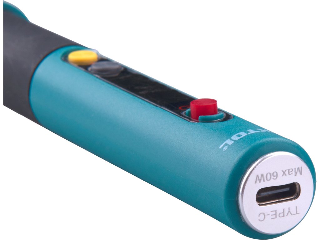 Profesionální mikroprocesorová hrotová pájka s displejem je určena k měkkému pájení, které vyžaduje přesnost a kontrolu teploty hrotu, zejména v elektronice a v bižuterii. S použitím vhodného pájecího hrotu lze pájku použít také k drobnému řezání či spojování plastů a také k vypalování symbolů do dřeva. V pájce se používají přímo žhavené hroty typu T9. Je to nejmodernější typ hrotů, kde hrot, topidlo a termistor jsou zataveny v jednom celku. Protože je mezi těmito částmi minimální tepelná ztráta a vzdálenost, jsou ty hroty efektivnější a lze s nimi dobře pájet již od 330°C. U předchozích typů hrotů je tato hranice kolem 350°C. Teplotní čidlo ve spojení s mikroprocesorem zajišťuje zpětnovazební kontrolu a pájka reaguje velmi rychle na změnu teploty hrotu. Použitý LCD displej má perfektní viditelnost pod všemi úhly a při jakýchkoliv světelných podmínkách. Zobrazuje se na něm jak cílová teplota, tak okamžitá teplota hrotu a indikátor nahřívání. Jednotky teploty si můžete zvolit mezi ˚C a ˚F. Pomocí tlačítek nastavíte teplotu v rozsahu 80–450°C. Pájka je vybavena několika funkcemi: nastavení startovací teploty, kalibrací, spánkem a zámkem. Pomocí funkce nastavení startovací teploty si nastavíte teplotu která se objeví po zapnutí pájky. Kalibrací teploty můžete kompenzovat teplotní ztráty, které vzniknou při použití větších hrotů v rozsahu ±50˚C. Funkce spánku dovoluje pájce "usnout" po uplynutí nastavené doby na 80˚C. Po 30min ve "spánku" se pájka vypne. Zámkem nastavíte heslo, které je nutno zadat, aby jste mohli měnit nastavení pájky. Pájka má také ESD ochranu proti výboji statické elektřiny. Plastový přechod mezi kovovou a plastovou částí je vyroben ze speciálního vysoce tepelně odolného plastu a ručka je potažená silikonem pro příjemné držení při práci. Balení neobsahuje USB zdroj, ale můžete použít jakýkoliv zdroj, který má minimální technickou specifikaci uvedenou v parametrech. Pájku sice lze nouzově použít s 5V nebo 9V, ale práce je velmi pomalá. Doporučujeme zdroje, které dávají 12V/1,7A a více. Protože pájka používá standardní USB-C konektor, lze použít také QC/PD powerbanky nebo USB nabíječky do auta, což dovoluje pájení na jakémkoliv místě. Součástí balení je menší stojánek s houbičkou pro odložení pájky a 1,5m kabel USB-A — USB-C s max. 12V napětím.Doplňkové parametry
