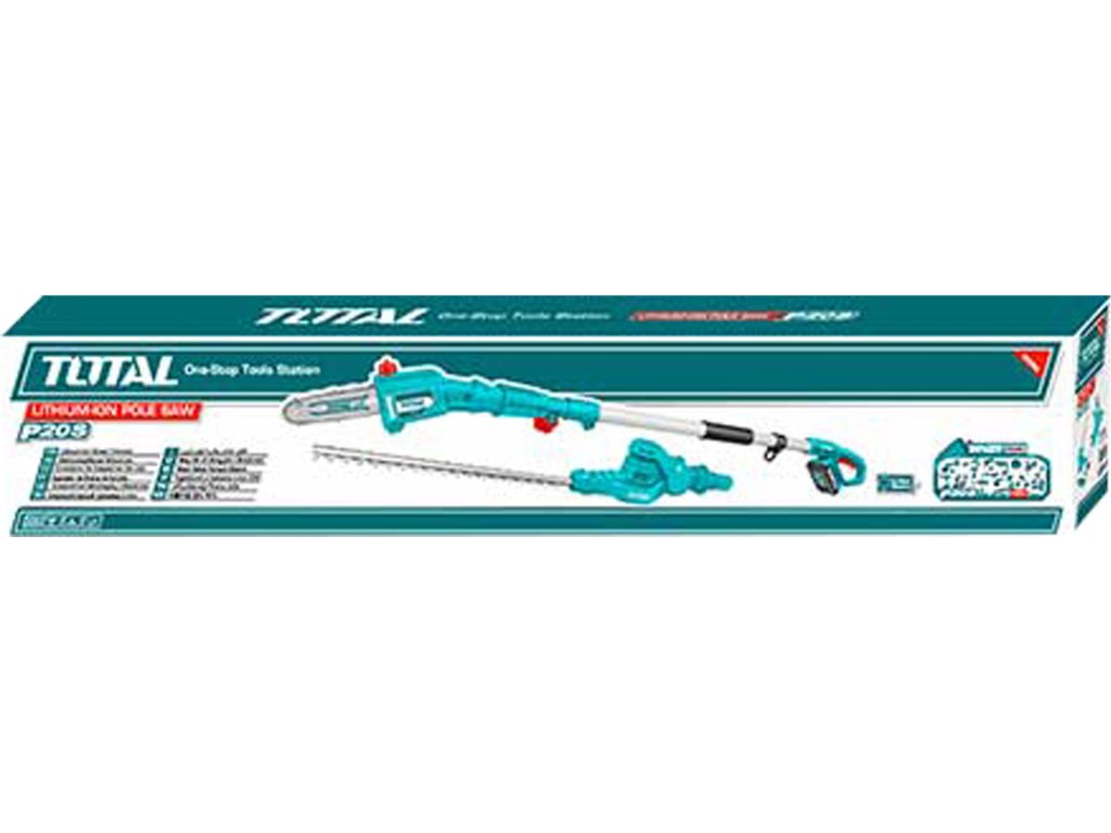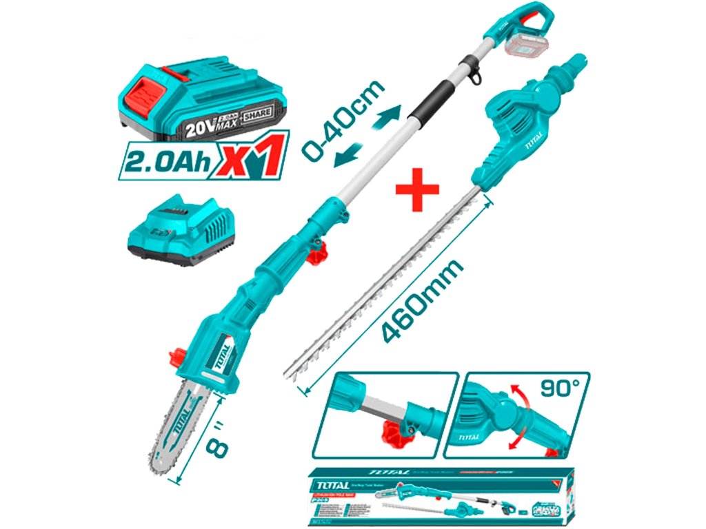 Tento set zahradního AKU nářadí se skládá z prořezávací pily na teleskopickém držáku, AKU nůžky na živé ploty, 1ks baterie a 1ks nabíječky. Akumulátorová prořezávací pila je určena k řezání či zkracování větví stromů a keřů do průměru 20 cm při rychlosti řetězu 4,8m/s. Nalézá tak uplatnění k prořezávání korun stromů v domácích zahradách, zejména stromů ovocných. Řetěz pily je samomazací, nemusíte tedy po pár minutách řezání řetěz ručně mazat. Kapacita olejové nádobky je 70ml.Aku nůžky na živé ploty jsou dlouhé 460mm s maximálním průměrem prořezu 18mm. Rychlost kmitu je 2800 kmitů za minutu.Doplňkové parametry