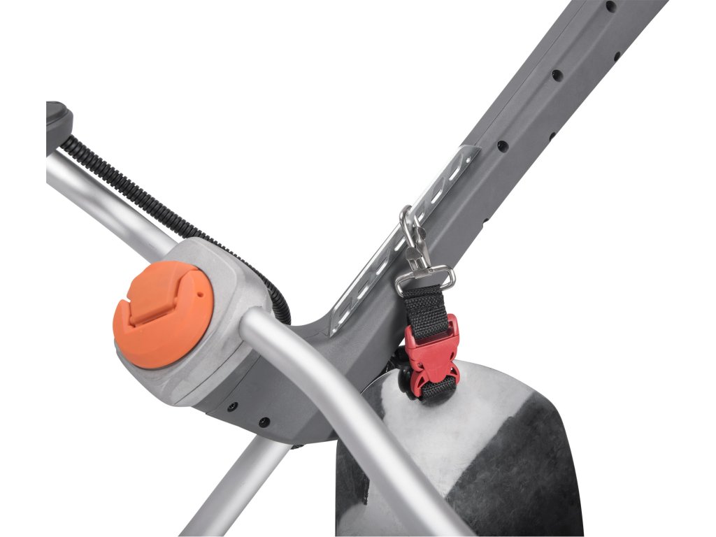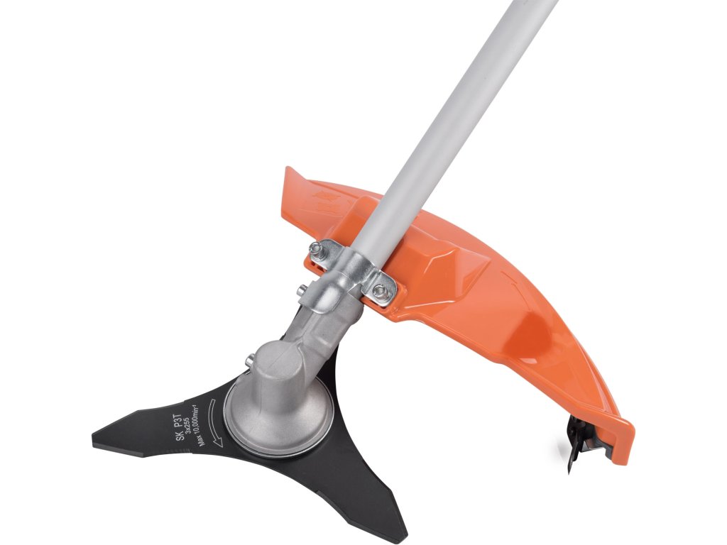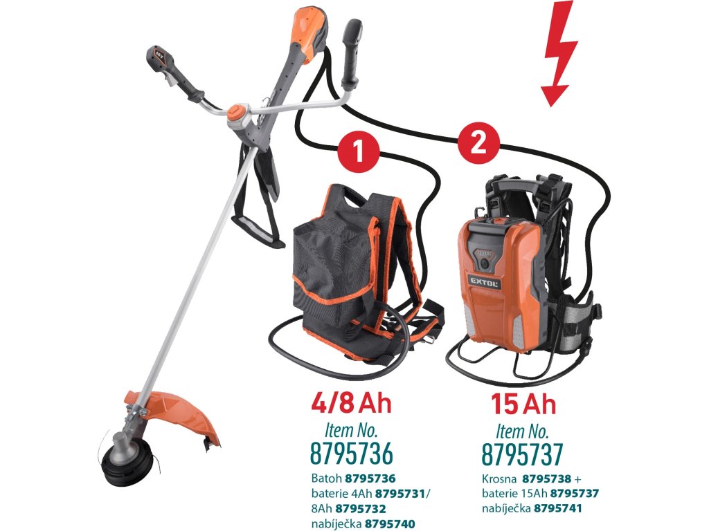 Velmi silný a výkonný aku křovinořez určený k sekání vysoké trávy nebo suché trávy, vysokých kopřiv a keřů a podrostu s průměrem kmene až 5cm s pomocí ocelového žacího nože nebo k sekání nižší trávy pomocí žací struny. Křovinořez je poháněn nejmodernějším „brushless” motorem. Tento nový typ motoru má vyšší životnost, je výkonnější a má menší spotřebu el. energie než klasické motory s uhlíkovými kartáči. Pro snížení hmotnosti a velikosti stroje je baterie umístěna v batohu na zádech a je připojena ke stroji pomocí silného kabelu. Pro napájení se používají 60V baterie, které jsou dostupné ve třech velikostech 4, 8, a 15Ah a zajišťují dostatek energie při práci. Všechny velikosti baterií jsou vybaveny indikací nabití. Pro snadnou manipulaci při sekání má křovinořez ergonomicky tvarované antivibrační rukojeti ve tvaru cyklořídítek a ramenní popruh se štítem na ochranu boku, který přenáší většinu hmotnosti na tělo a ruce používáte jen pro jemnou manipulaci při sekání. Na stroji je 7 pozic pro připnutí tohoto popruhu, což se používá k jemnému vyvážení při sekání. Na rukojeti je snadno přístupné tlačítko pro zapnutí a regulaci otáček ve 3 stupních: 4500/5200/7000 otáček/min. Díky použitému soft startu je start a veškeré změny otáček postupné a bez trhnutí stroje. Spoušť je vybavena pojistkou zabraňující náhodnému spuštění stroje při manipulaci. Při použití žací struny ji lze při práci prodloužit poklepem na zem. Pro běžnou práci postačuje 4Ah baterie, kterou dobijete za 45min v rychlonabíječce, pro náročnější nebo delší práci doporučujeme větší baterie s kapacitou 8–15Ah. Díky použité Li-ion technologii je možné baterie kdykoliv dobíjet, aniž by se tím snižovala jejich kapacita. Li-ion baterie ztrácí energii vlivem samovybíjení velmi pomalu a vydrží dlouho nabité a připravené k použití.Doplňkové parametry