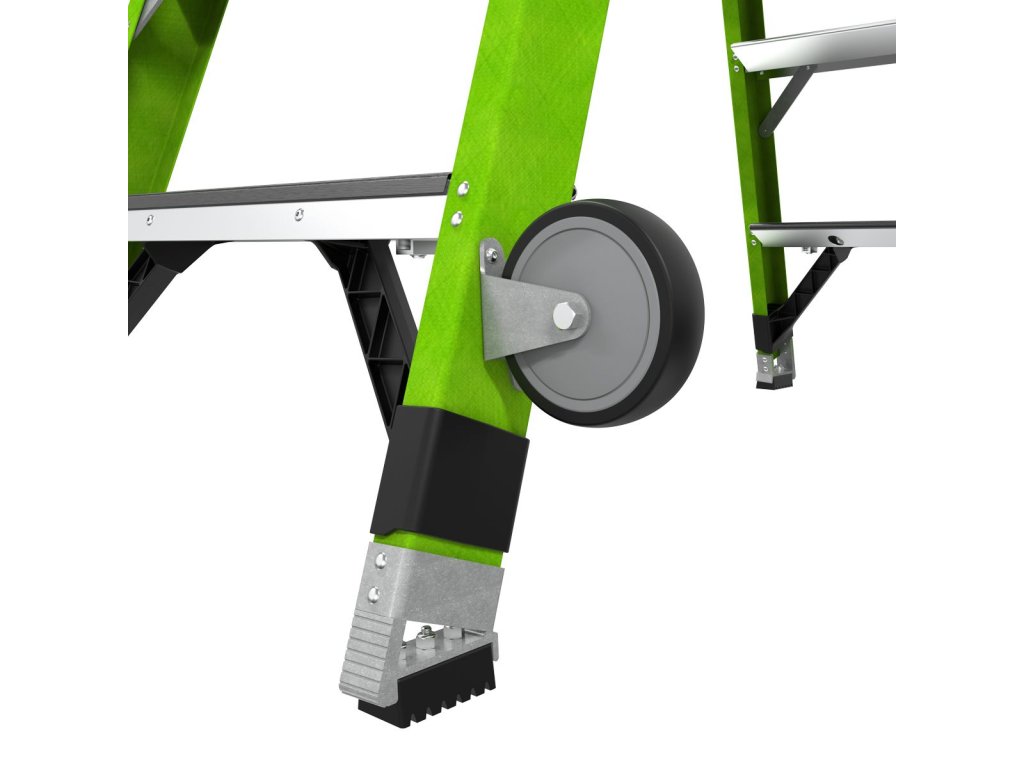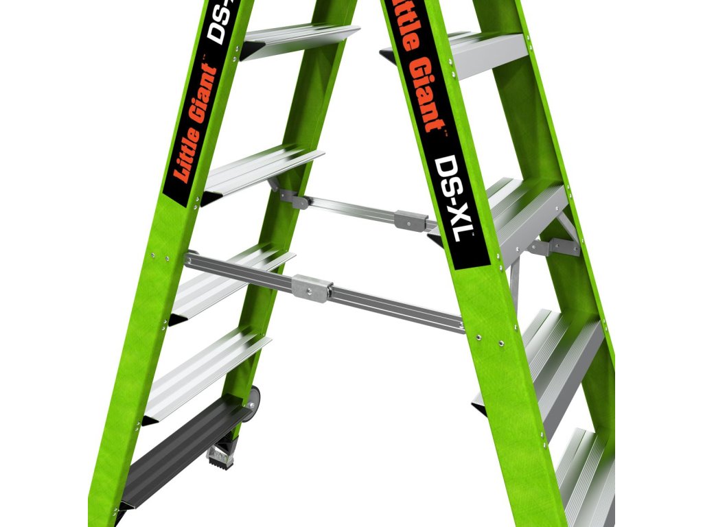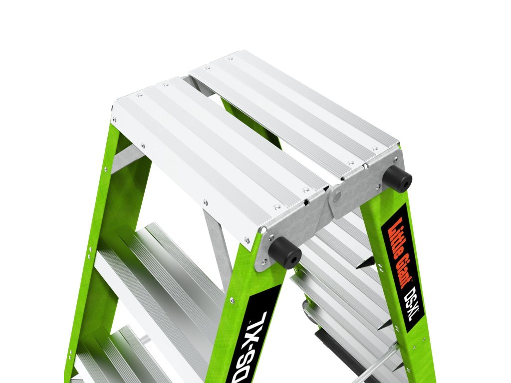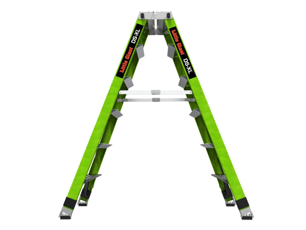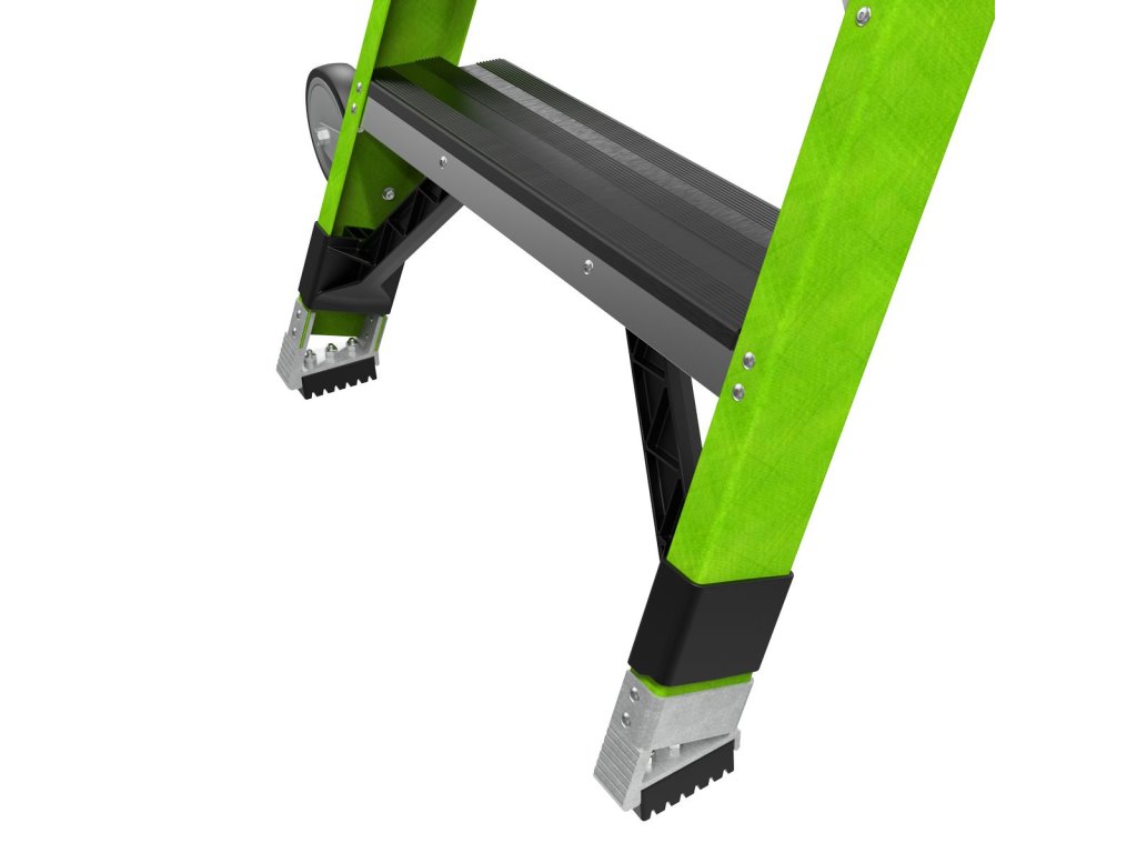 DS-XL Double-Sided™ Oboustranný, nevodivý, Hi-Viz zelený sklolaminát (fiberglass) DS-XL™ je navržený jako skutečný žebřík pro dvě osoby. Díky širokým příčkám se oba uživatelé při práci na žebříku cítí pohodlně a stabilně. Vyrobeno z lehkého a odolného skleněného vlákna, můžete pracovat s elektřinu bez obav z vodivosti. Reflexní Hi-Viz zelená barva je také lépe vidět v prostoru - snižuje tak nebezpečí ostatních osob narazit do žebříku. Ground Cue® Na žebříku DS-XL™ si můžete vychutnat výhody oboustranného výstražného systému spodního schůdku Ground Cue® . Když dojdete ke spodní příčce, Ground Cue slyšitelně „cvakne“, abyste věděli, že jste na posledním schůdku a můžete tak bezpečně stoupnout na zem. Tip & Glide™ Díky kolečkům Tip & Glide™ je manipulace a přesun žebříku z místa na místo snadný a pohodlný. Tlumení nárazů Při přepravě může snadno dojít k poškození žebříku. Proto je DS-XL™ opatřen prvky pro lepší tlumení nárazů, které pomáhají udržet žebřík v bezpečném stavu. Ochranné kryty bočnic a vzpěry nohou pohlcují nárazy a zvyšují celkovou odolnost konstrukce. Gumové nárazníky chrání sklolaminát před poškozením v případě převrácení během přepravy. Hodnocení Duty Rating Tento žebřík dosahuje hodnocení IAA, který splňuje nebo překračuje všechny standardy OSHA a ANSI, s kapacitou 375 liber (170 kg).Doplňkové parametry