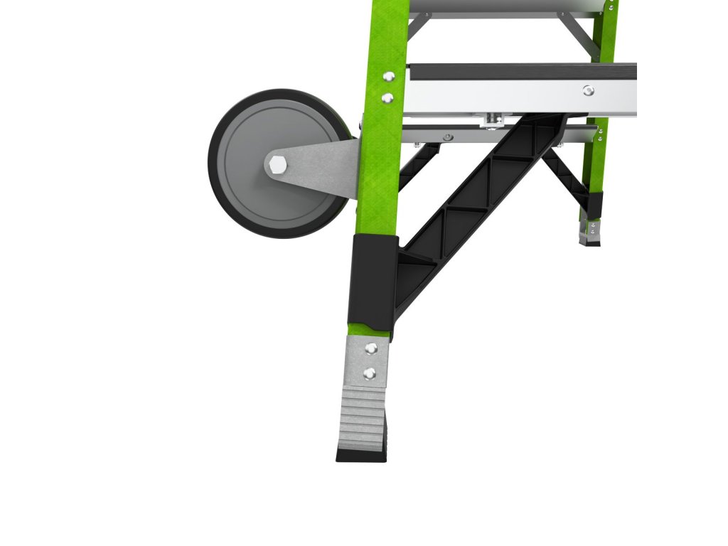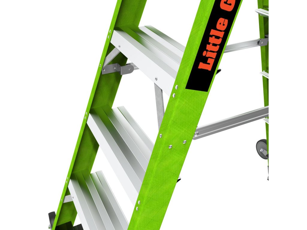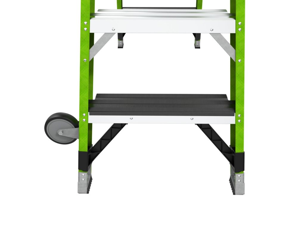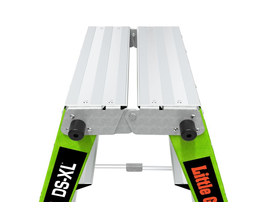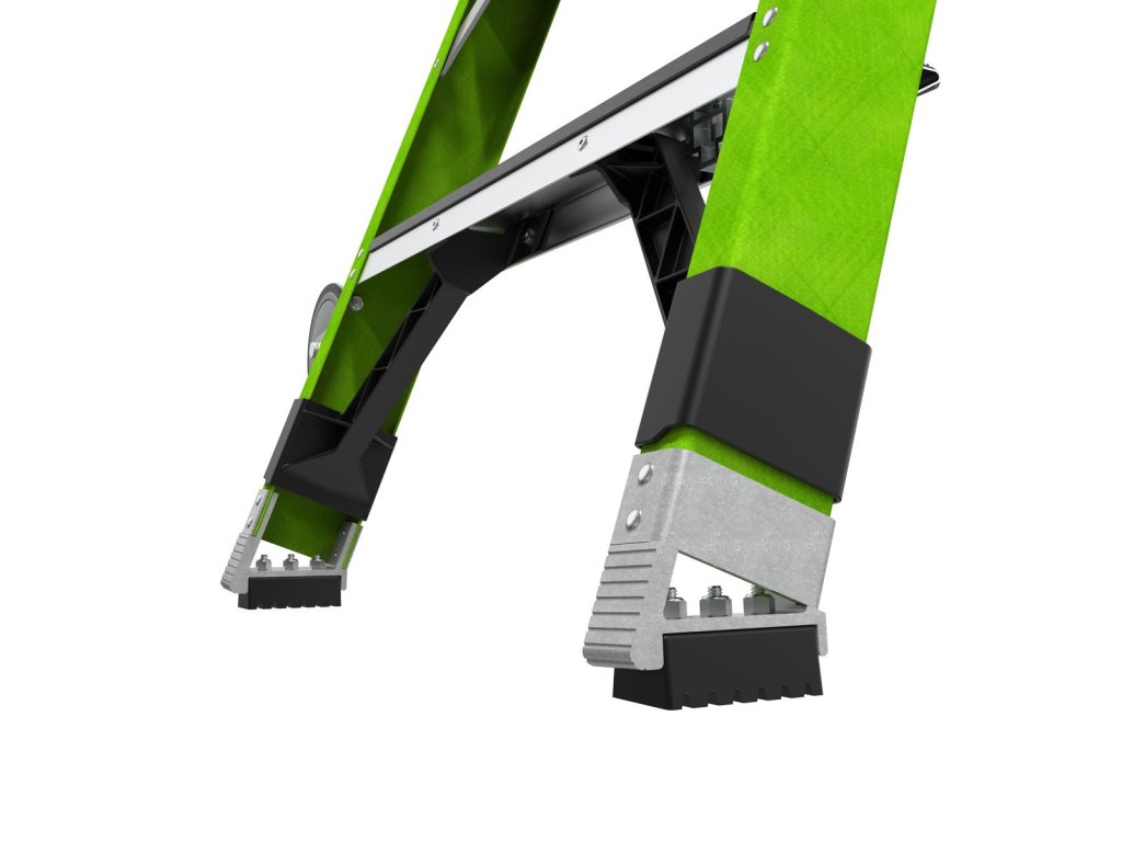 DS-XL Double-Sided™ Oboustranný, nevodivý, Hi-Viz zelený sklolaminát (fiberglass) DS-XL™ je navržený jako skutečný žebřík pro dvě osoby. Díky širokým příčkám se oba uživatelé při práci na žebříku cítí pohodlně a stabilně. Vyrobeno z lehkého a odolného skleněného vlákna, můžete pracovat s elektřinu bez obav z vodivosti. Reflexní Hi-Viz zelená barva je také lépe vidět v prostoru - snižuje tak nebezpečí ostatních osob narazit do žebříku. Ground Cue® Na žebříku DS-XL™ si můžete vychutnat výhody oboustranného výstražného systému spodního schůdku Ground Cue® . Když dojdete ke spodní příčce, Ground Cue slyšitelně „cvakne“, abyste věděli, že jste na posledním schůdku a můžete tak bezpečně stoupnout na zem. Tip & Glide™ Díky kolečkům Tip & Glide™ je manipulace a přesun žebříku z místa na místo snadný a pohodlný. Tlumení nárazů Při přepravě může snadno dojít k poškození žebříku. Proto je DS-XL™ opatřen prvky pro lepší tlumení nárazů, které pomáhají udržet žebřík v bezpečném stavu. Ochranné kryty bočnic a vzpěry nohou pohlcují nárazy a zvyšují celkovou odolnost konstrukce. Gumové nárazníky chrání sklolaminát před poškozením v případě převrácení během přepravy. Hodnocení Duty Rating Tento žebřík dosahuje hodnocení IAA, který splňuje nebo překračuje všechny standardy OSHA a ANSI, s kapacitou 375 liber (170 kg).Doplňkové parametry