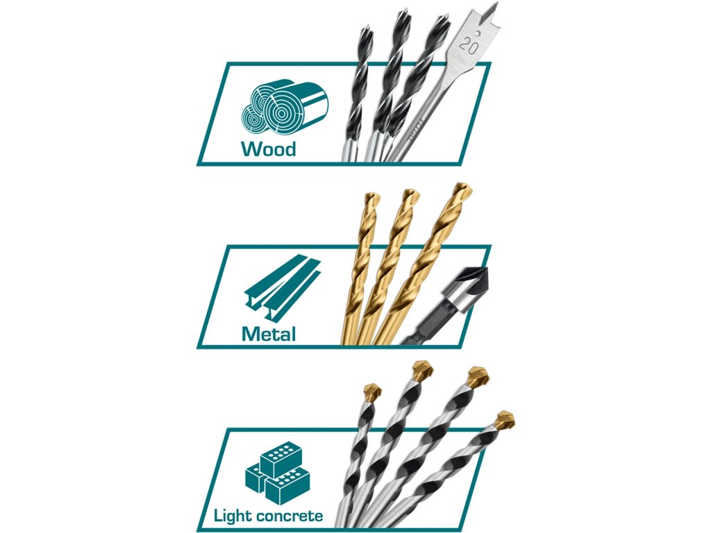 kladivo, vodováha mini, hex klíče, nůž ulamovací, vrtáky do zdiva, kovu a dřeva, hroty, držák hrotů, hlavice, držák na hlaviceDoplňkové parametry