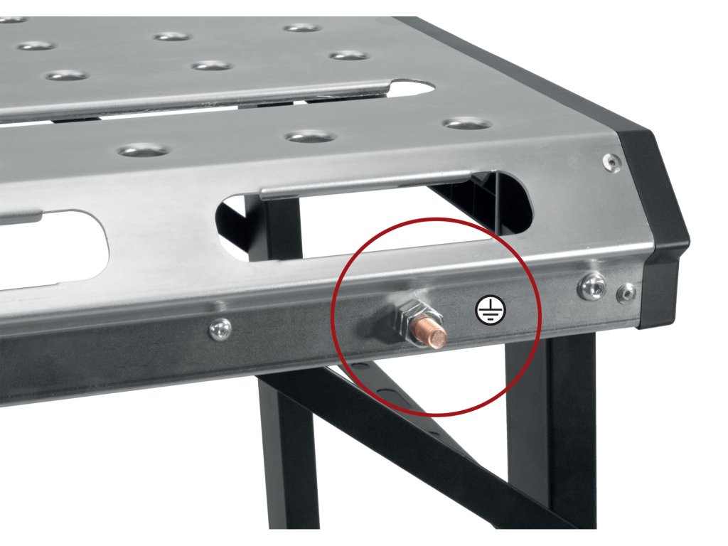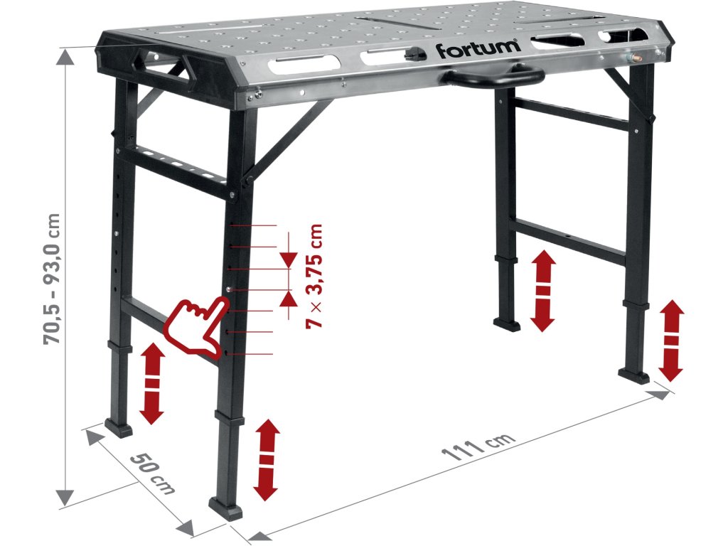 Přenosný svařovací stůl FORTUM s výškovým nastavením pracovní plochy o rozměrech 107x53cm vyrobené z galvanizovaného ocelového 2mm tlustého plechu s množstvím manipulačních výřezů a otvory o průměru 20mm pro vymezovací/opěrné zarážky nebo upínací svěrky Max. nosnost stolu je 454kg .Doplňkové parametry