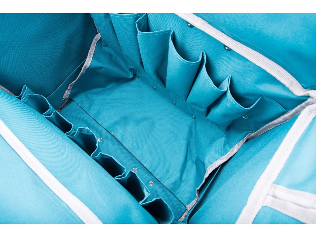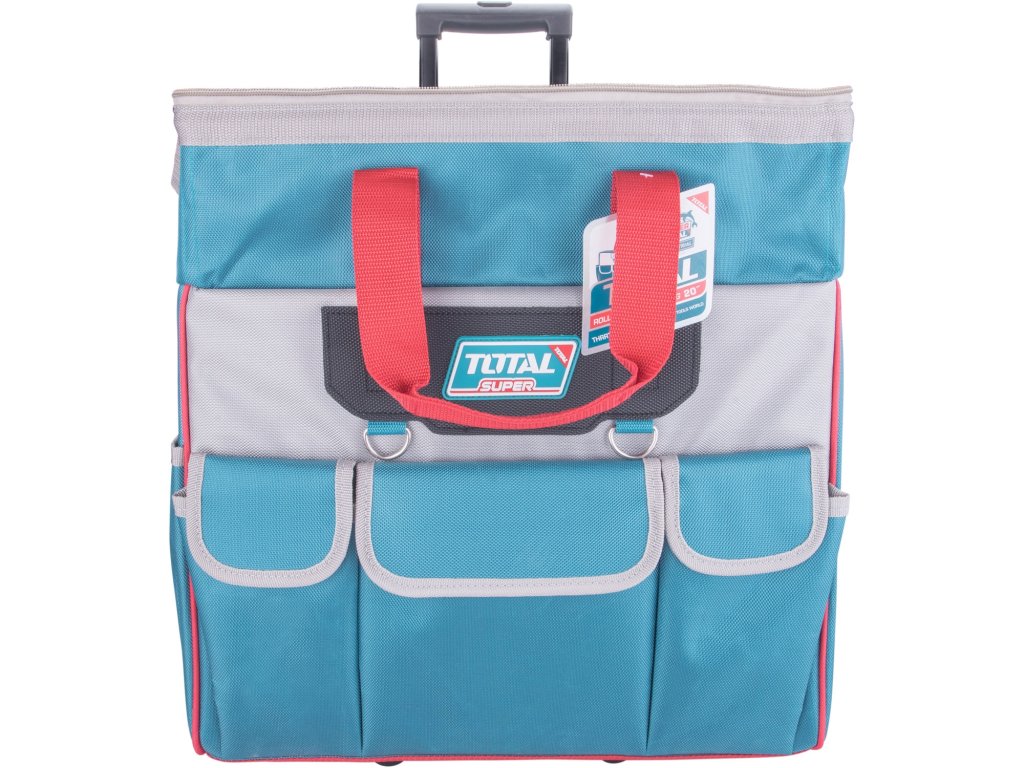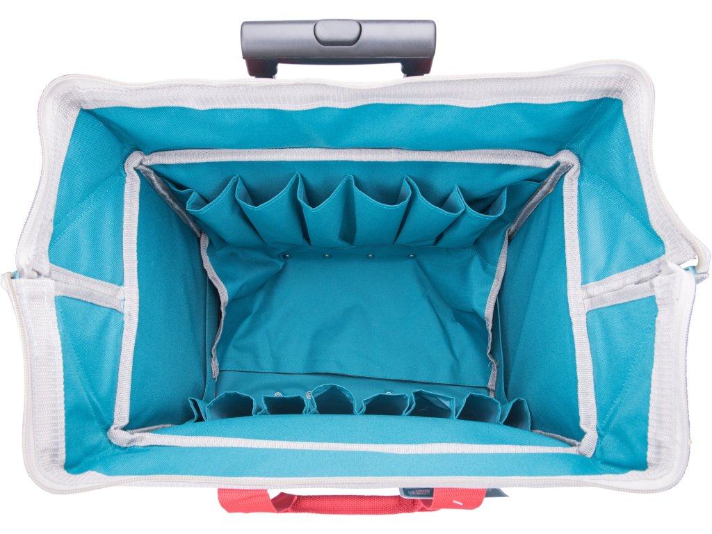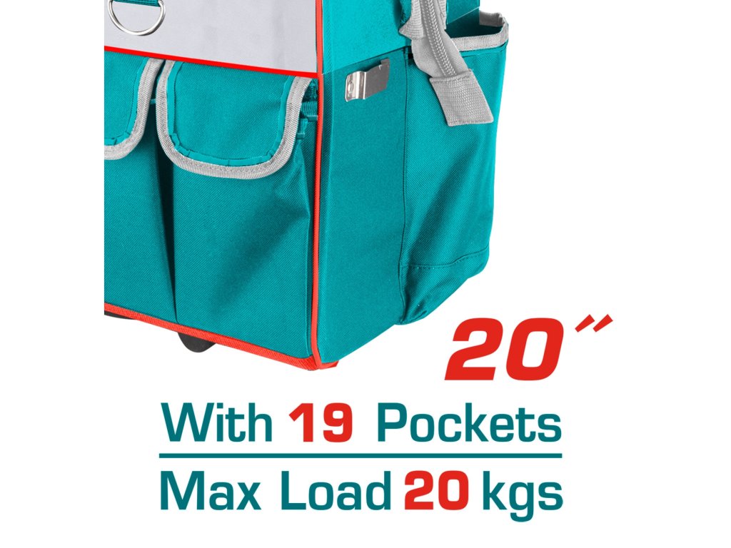 Taška na nářadí s šířkou 45cm. Taška je vybavena pojezdovými kolečky s polohovatelnou rukojetí. Vevnitř tašky je velký úložný prostor pro nářadí. Po stranách úložného prostoru je na jedné straně 7 a na druhé straně 6 kapes pro nářadí jako kleště, šroubováky atd.. Hlavní úložný prostor se otevírá nahoru po dvou stranách, což umožňuje lepší využití vnitřního prostoru. Uzavíratelné na zip. Na vnější čelní straně tašky jsou dvě menší a jedna větší kapsa na suchý zip. Z boku tašky jsou rovněž kapsy pro možné uskladnění nářadí. Taška je vybavena uchy pro pohodlné nošení. Materiál: 600D a 1680D polyester a materiál proti vlhkosti na stranách. Maximální nosnost 20kg, s kolečky a teleskopickou výsuvnou rukojetí. Délka, šířka, výška: 45x28x36cm. Pevný rám pro snadné otevírání a přístup.Doplňkové parametry